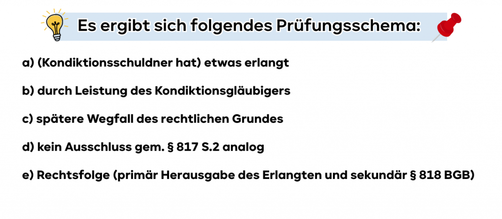 Ein Anspruch aus condictio ob causa finitam gemäß § 812 I 2 Alt. 1 BGB gliedert sich zunächst in fünf Prüfungsschritte. Bei der condictio ob causa finitam hat der Anspruchsgegner durch Leistung des Anspruchsstellers etwas erlangt, der rechtliche Grund zum Behalten dürfen ist aber später weggefallen. Es ergibt sich folgendes Prüfungsschema.