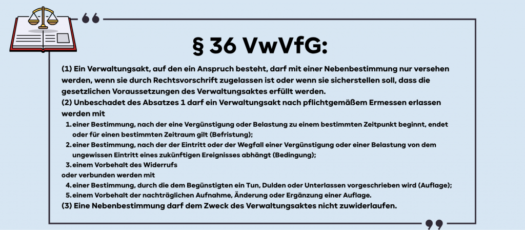 Um die Norm  des § 36 VwVfG zu verstehen, widmen wir uns zunächst ihrem grundlegenden Regelungsgehalt. Wenn wir uns einmal den Wortlaut der Norm anschauen, stellen wir fest, dass sich § 36 I VwVfG auf einen Verwaltungsakt bezieht, „auf den ein Anspruch besteht“. Es geht in Absatz 1 also ausschließlich um gebundene Entscheidungen der Behörde hinsichtlich des Haupt-Verwaltungsaktes. Absatz 2 hingegen befasst sich sodann mit Verwaltungsakten, welche nach „pflichtgemäßem Ermessen“ erlassen werden. § 36 III VwVfG enthält ein generelles – für Absatz 1 und 2 geltendes – Verbot von Nebenbestimmungen, die dem Zweck des Verwaltungsakts zuwiderlaufen.