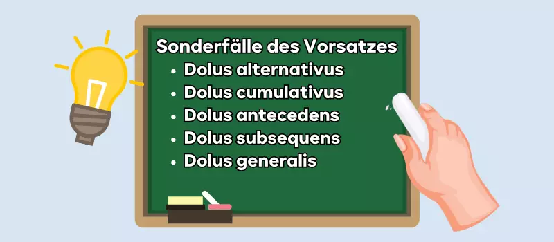 Neben den 3 Formen des Vorsatzes in der Gestalt der Absicht (dolus directus 1. Grades), des direkten Vorsatzes (dolus directus 2. Grades) und des Eventualvorsatzes (dolus eventualis) sind auch 5 Sonderfälle des Vorsatzes zu unterscheiden: